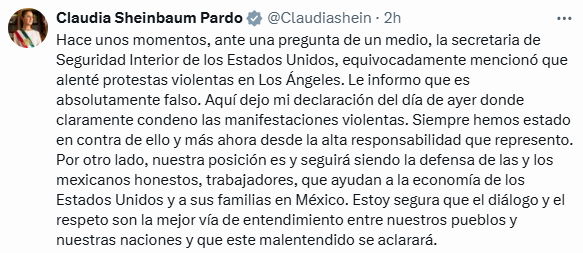 “Claudia Sheinbaum salió y alentó más protestas en Los Ángeles y la condeno por eso. No debería estar fomentando esas protestas violentas que están ocurriendo. Sí, se permite a las personas protestar pacíficamente, pero la violencia que estamos viviendo no es aceptable y no va a suceder en Estados Unidos. Este presidente, Trump, está defendiendo al estadounidense promedio que quiere llevar a sus hijos a la escuela todos los días de manera segura, administrar su pequeño negocio y proveer para sus familias”, comentó Kristi Noem.