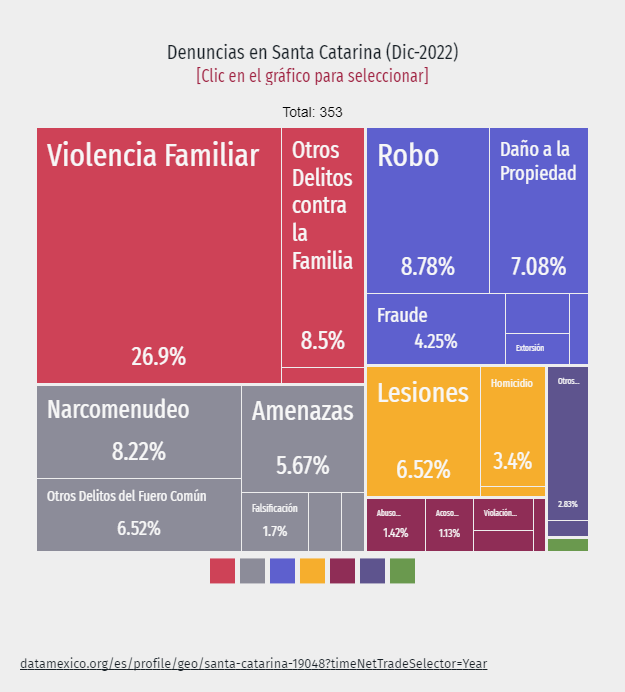 Hasta diciembre de 2022, el principal delito en Santa Catarina era la violencia familiar con el 26.9 por ciento de las denuncias, seguido del robo 8.78 por ciento y narcomenudo con 8.22 por ciento.