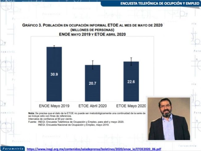 De acuerdo con la encuesta telefónica de ocupación y empleo (ENOE) del Inegi, para abril y mayo, en ese periodo dos millones de personas pasaron al subempleo y 1.9 millones de personas pasaron a la informalidad, señaló el Dr. Francisco Abundis, director asociado de Parametría.