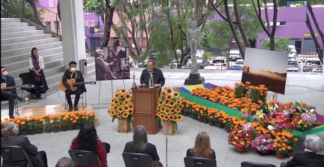 En medio de flores de cempasúchil, el Ariel de Oro que recibió en 2010 y otra estatuilla de las cinco que recibió a lo largo de sus 56 años de trayectoria, el cineasta Felipe Cazals recibió un homenaje póstumo por parte de sus amigos y colegas de la comunidad cinematográfica.