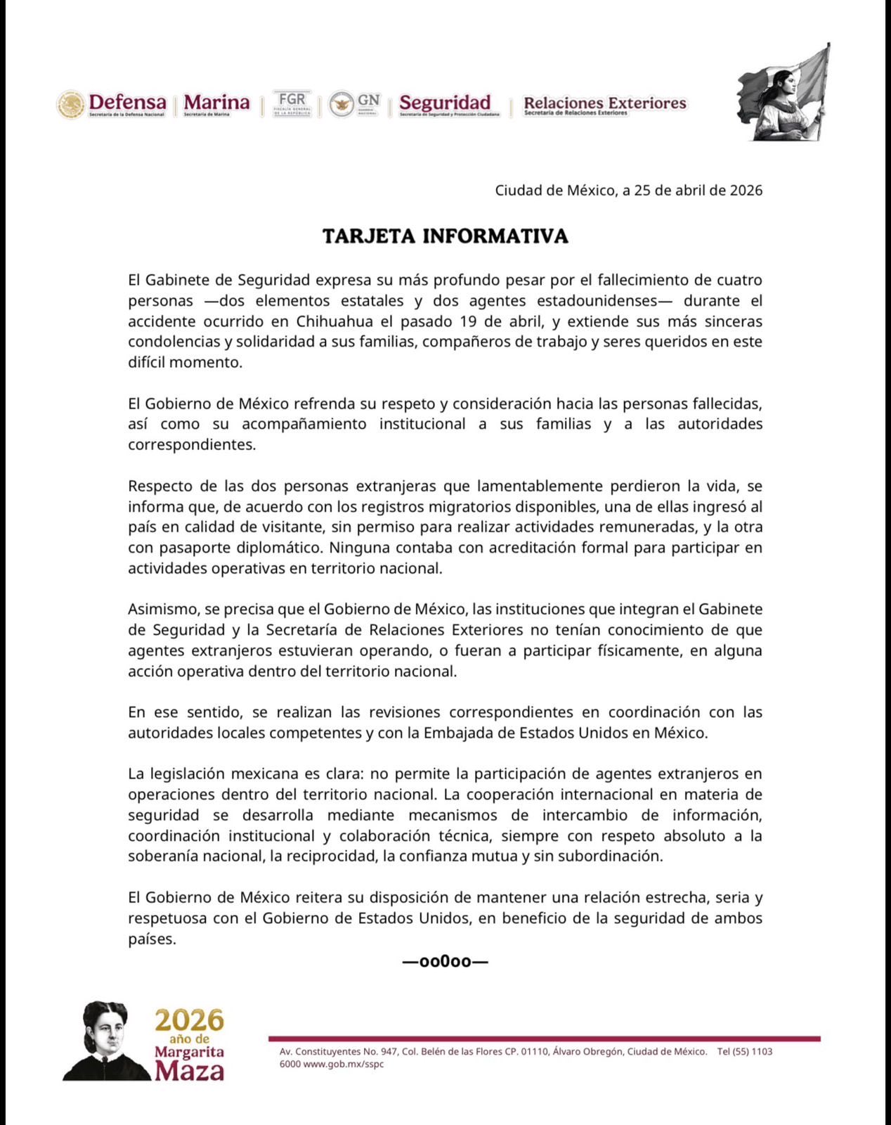 A la par, el Gabinete expresó su pesar por el fallecimiento de los dos agentes de EU y dos elementos de la policía estatal. Recordó que los decesos ocurrieron durante un accidente registrado el pasado 19 de abril en el estado de Chihuahua.