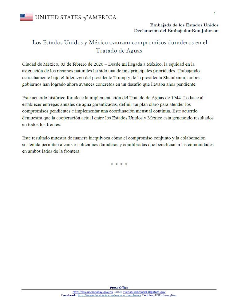 «El acuerdo entre Estados Unidos y México para abordar la escasez de agua en México es otro ejemplo de cómo el presidente Trump cumple con el pueblo estadounidense. Esto representa una victoria para los agricultores y ganaderos estadounidenses, y agradecemos los constantes esfuerzos del presidente Claudia Sheinbaum por cumplir con las responsabilidades de México en virtud del Tratado del Agua de 1944″.