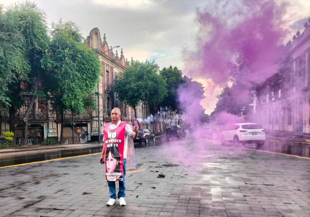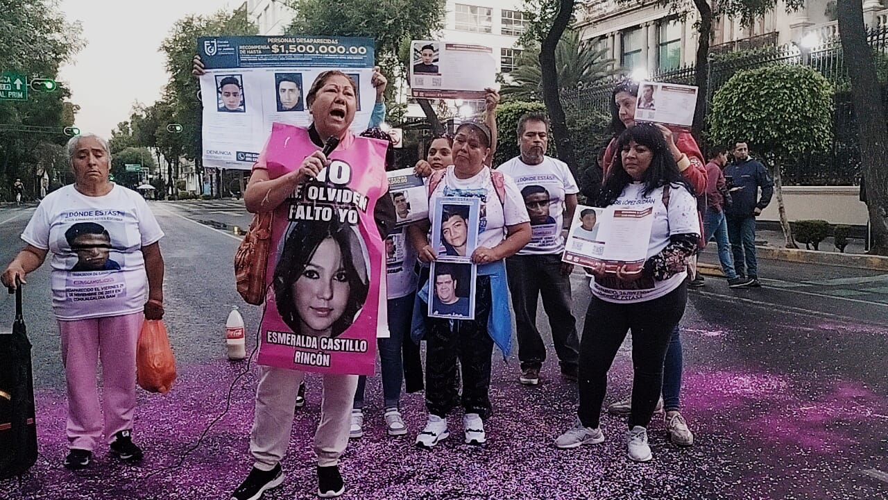 José Luis Castillo encendió bombas de humo morado y rosa, caminó hacia la avenida Bucareli, cerró el paso a automovilistas y pasó el micrófono a los presentes para que dijeran el nombre de su familiar y sus peticiones al gobierno.