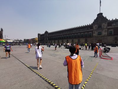 En la plancha del Zócalo, frente a Palacio Nacional se delimitó una cancha de 20 por 4 con dos pequeñas porterías donde equipos de cinco integrantes jugaron la cascarita a 20 minutos o cinco goles, con invitación abierta a toda mujer que se animará a integrar algún equipo como “Naranjas”, “Moradas”, “Pamboleras” o “No tengo de idea” que de esta manera deportiva, buscaron visibilizar la lucha contra la violencia de género y en defensa de la igualdad en el deporte.
